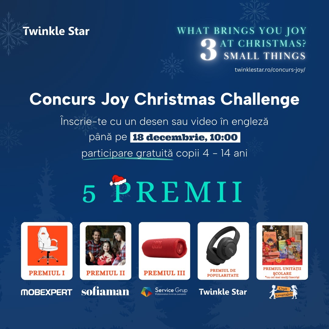 https://twinklestar.ro/concurs-joy/ 𝐉𝐎𝐘 𝐂𝐇𝐑𝐈𝐒𝐓𝐌𝐀𝐒 𝐂𝐇𝐀𝐋𝐋𝐄𝐍𝐆𝐄: 🎄 Invităm copiii între 𝟒-𝟏𝟒 𝐚𝐧𝐢 pasionați de limba engleză să se înscrie la #joychristmaschallenge – concurs național cu participare gratuită organizat de Twinkle Star. ✅ Înscrierea se realizează de un părinte, prin completarea formularului de înscriere până pe 18 decembrie, ora 10.00: https://bit.ly/concurs-joy-tws 📍 Materialul din concurs poate fi un